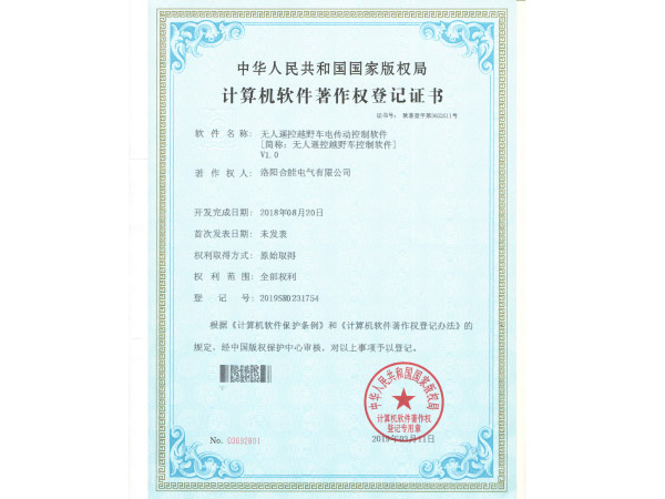 無人遙控越野車電傳動控制軟件著作權(quán)登記證書